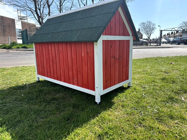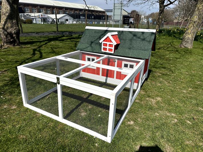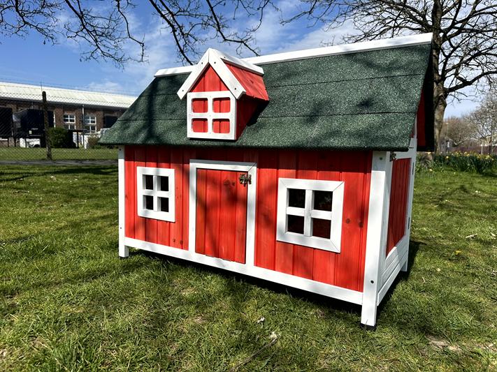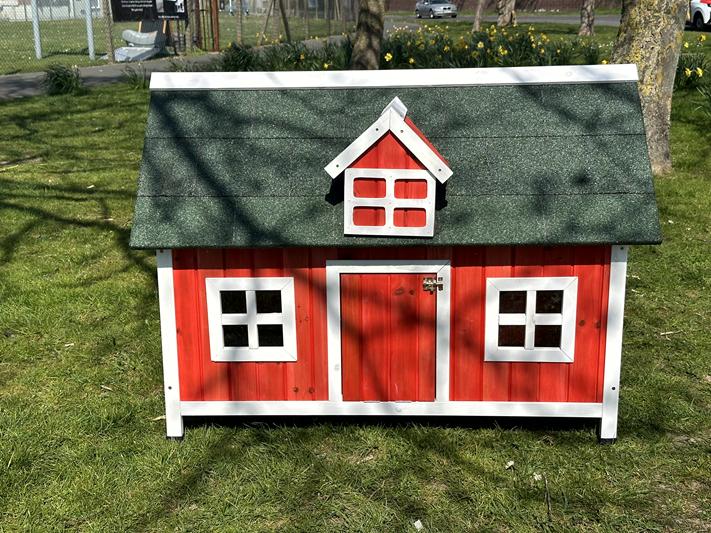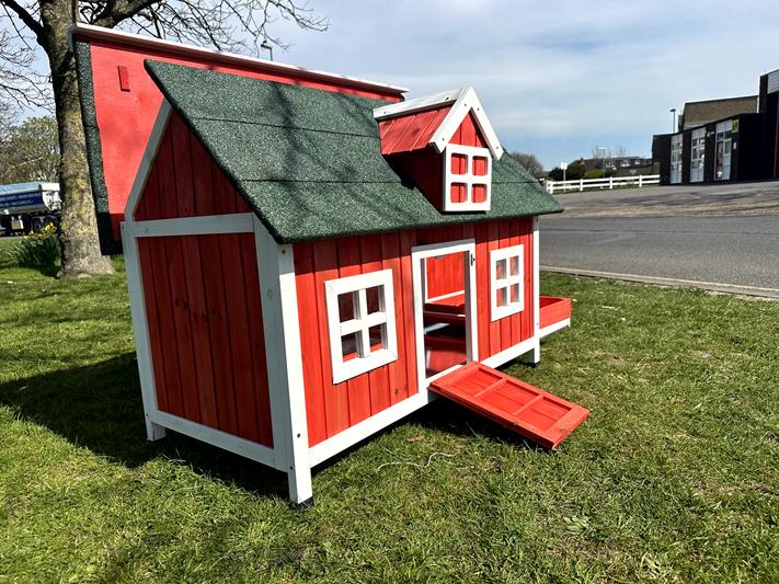 The Farm House Red Chicken Coop measures including nest box and roof overhangs approx 115cm wide x 68cm deep x 86cm high