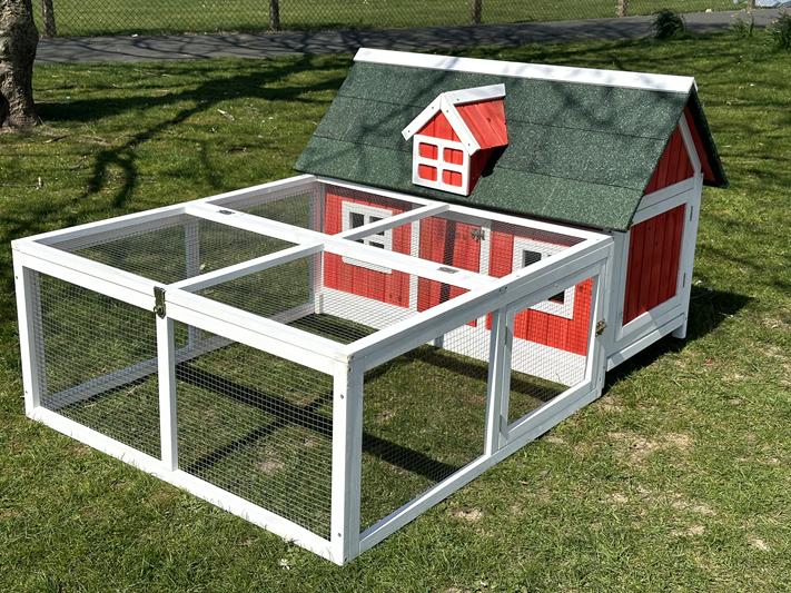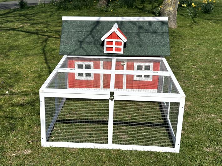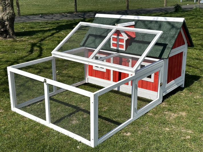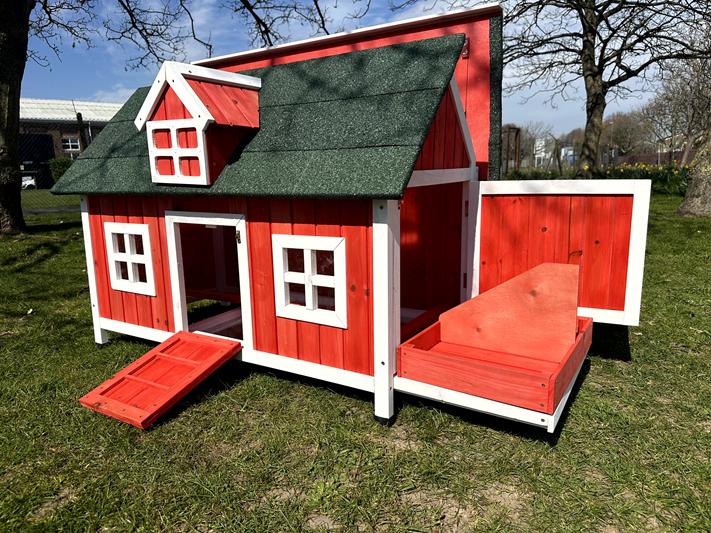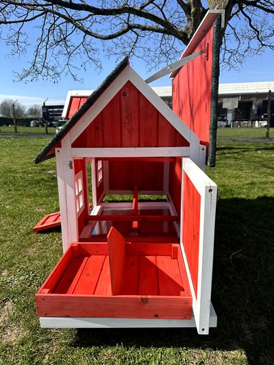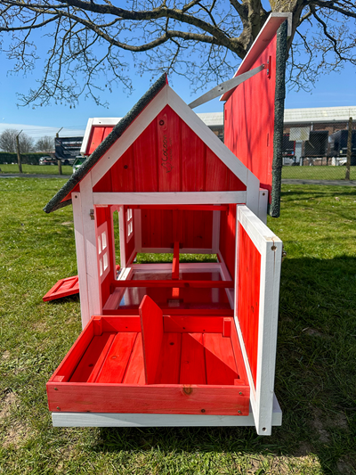 Our stunning Farm House Red Chicken Coop has a metal lined pull out tray for easy cleaning. A big front door including an access ramp will make it easy for your chickens to get in and out and to add ventilation to your coop.